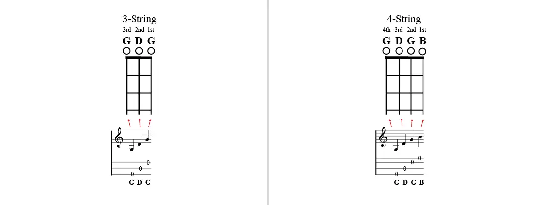 3 and 4-string cigar box guitar tuned to GDG and GDGB showing string names.