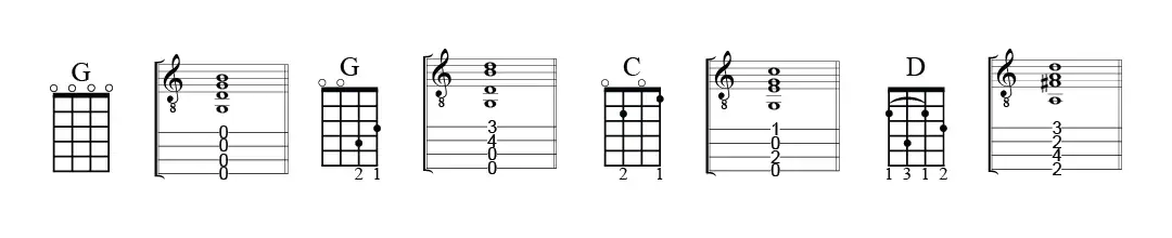 Moving from left to right, the image then shows fingered versions of common chords, including G, C, and D. These chords are played by pressing down specific frets while strumming the strings.